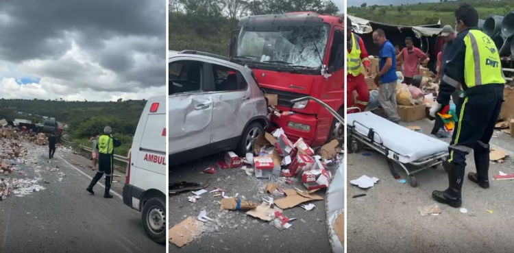 Acidente entre carreta e outros veículos deixa feridos e trava o trânsito na BR-116, trecho entre Irajuba e Brejões