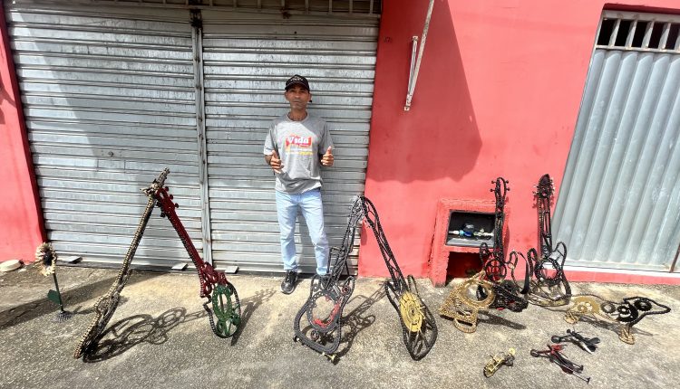 A reportagem do blog Jequié Urgente, foi até o bairro Pompílio Sampaio, onde entrevistamos o artista Manoel Pinheiro, conhecido como “Corredor”. Manoel trabalha com a fabricação de réplicas de instrumentos musicais, que são feitos basicamente com peças de sucata de motocicletas.