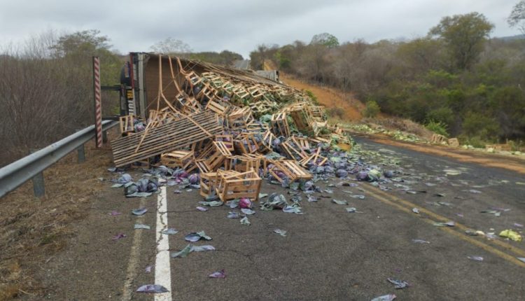 Caminhão carregado com repolho tomba na BA-026 próximo a cidade de Maracás