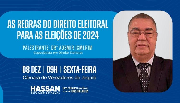 A convite do deputado estadual Hassan (PP), o professor e advogado Ademir Ismerim, especialista em Direito Eleitoral, fará palestra em Jequié, sobre ‘As regras do Direito Eleitoral para as eleições de 2024’. Destinado a prefeitos, vice-prefeitos, vereadores, presidentes de partidos políticos, advogados, contabilistas, pré-candidatos, jornalistas e pessoas interessadas no tema, o evento acontecerá no dia 8 de dezembro deste ano, às 9 horas, no plenário da Câmara de Vereadores de Jequié, com inscrições gratuitas.