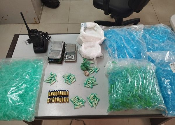 Uma denúncia anônima levou a Polícia Militar a apreender mais de 1kg de cocaína no bairro Euclides Neto. A ação policial ocorreu na manhã de terça-feira (22), na Rua 19 de Abril, onde ao menos três suspeitos estariam vendendo drogas em duas casas abandonadas. Ao avistar a guarnição, os indivíduos conseguiram fugir. Nas residências citadas na denúncia, a Polícia Militar conseguiu apreender 1kg de cocaína embalada em dois pacotes, 58 pinos com a droga, 18 munições de calibre 9mm, duas balanças de precisão, um rádio comunicador e 5 mil pinos para acondicionamento de cocaína. O material apreendido foi apresentado na delegacia local. Informações e Foto: Site Giro Ipiaú