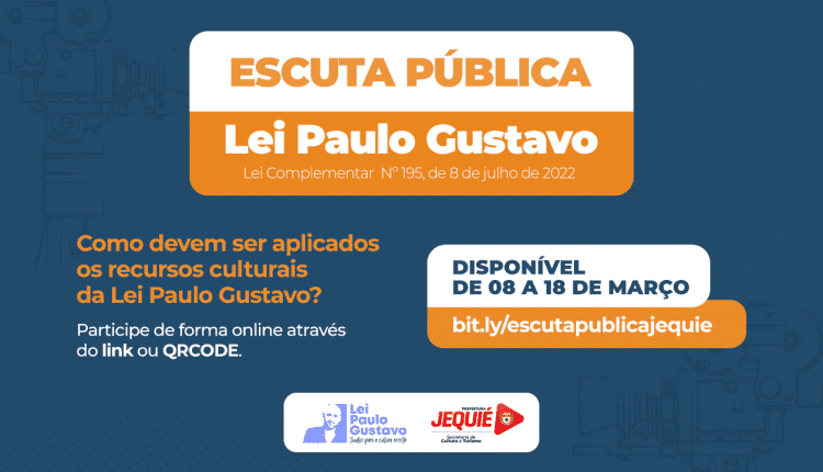 A Prefeitura de Jequié, através Secretaria de Cultura e Turismo, abriu, nesta terça-feira, 7, uma escuta pública para acolher sugestões sobre a aplicação da Lei Paulo Gustavo no município. A pesquisa, disponível a partir desta quarta-feira, 8, indo até o dia 18 de março, é voltada aos artistas, produtores culturais e a toda a população, com o objetivo de coletar propostas de mecanismos de financiamento que devem ser aplicados para o fomento da cultura jequieense.