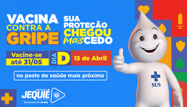 A Prefeitura de Jequié, através da Secretaria de Saúde, realiza neste sábado, 13, o Dia D da Vacinação contra a Influenza para todo o público-alvo da campanha. As pessoas elegíveis devem procurar qualquer uma das Unidades de Saúde da sede do município, no horário das 8h às 17h, e na Zona Rural, das 8h às 14h, munidas de documento com foto e caderneta de vacinação. No caso dos profissionais dentro do perfil de vacinação, é necessário apresentar comprovante de vínculo ativo.