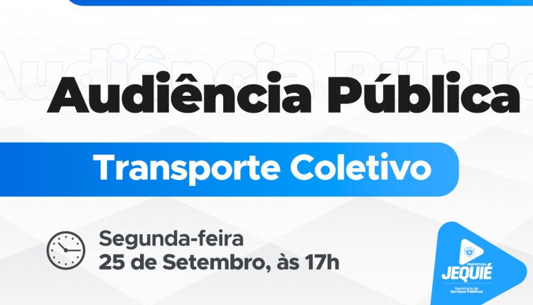 A Prefeitura de Jequié, através da Secretaria de Serviços Públicos, promove na segunda-feira, 25, às 17h, uma audiência pública na Câmara Municipal, destinada a discutir, coletivamente, as demandas, solicitações, além das sugestões de melhorias para a construção do processo licitatório relativo ao transporte público do município.