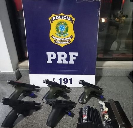A Polícia Rodoviária Federal (PRF) apreendeu, na noite da última terça-feira (11), 5 pistolas calibre 9mm e 15 carregadores durante abordagem a um ônibus que fazia o itinerário São Paulo (SP) x Aurora (CE). O flagrante aconteceu no Km 677 da BR 116, trecho do município de Jequié, localizado no centro-sul do estado.