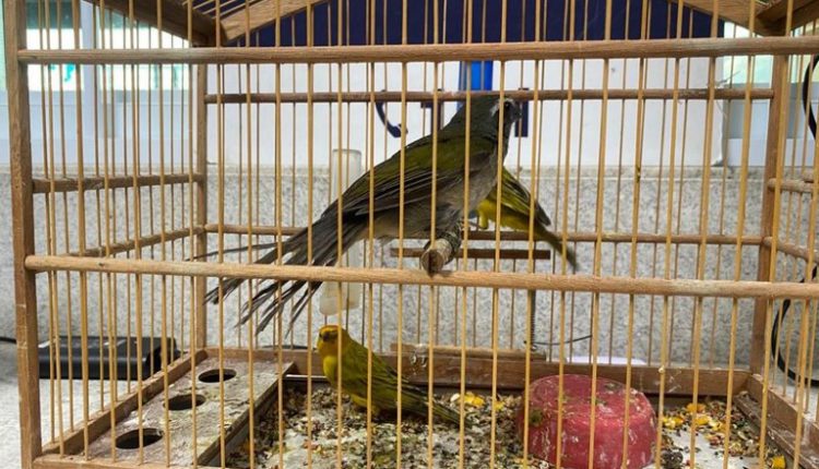 A Polícia Rodoviária Federal abordou um ônibus no km 830 da BR 116, em Vitória da Conquista (BA). No interior do veículo, foi identificada uma gaiola e uma caixa de papelão contendo 01 trinca ferro, 02 canários da terra e 01 jacu.