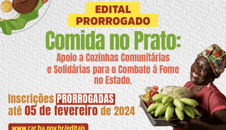 Foi prorrogado, até o próximo dia 05 de fevereiro, o envio de propostas para o Edital do Governo do Estado “Comida no Prato”, de apoio às cozinhas comunitárias e solidárias para o fortalecimento da rede de equipamentos integrados para o combate à fome na Bahia.